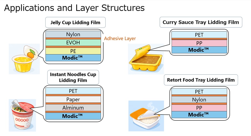 Modic™ Peelableは、インフレーション成形、Tダイキャスト成形、押出ラミネーションなど多様な加工プロセスに対応します。典型的な層構成は、PET基材//ポリオレフィン層/Modic™ Peelable層となります。グレード別の推奨プロセスと詳細な層構成例は技術資料をご参照ください。