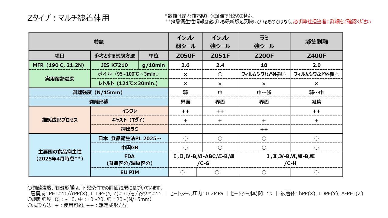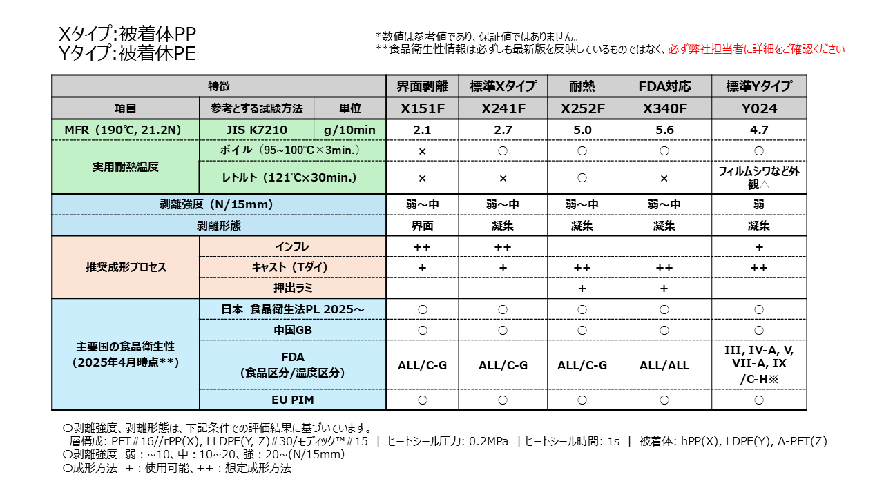 イージーピール樹脂は「開けやすさ」と「密封性」を同時に満たすため、剥離強度レンジやレトルト耐熱、内容物依存の経時安定性など、多変量最適化が必要なエンジニアリング材料です。Modic™ PeelableはPP/PE/マルチ基材向けにX・Y・Zの3タイプを用意し、凝集剥離・界面剥離メカニズムとヒートシール条件(温度・圧力・時間)を軸に、開封感や糸引き、剥離面外観をプロセス側からチューニングできる設計プラットフォームになっています。また、日本・米国FDA・EU・中国GBといった各国食品接触規制への対応グレードやバイオマスグレードを備え、グローバル対応とサステナ要件を前提に包装設計が行える点も、材料選定の立ち上げ段階で、前提条件として押さえておきたいポイントです。