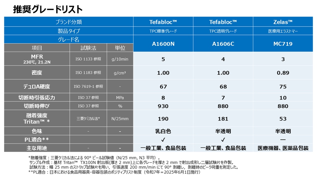 三菱ケミカルの評価結果では、以下のTefabloc ™、Zelas™の3グレードがトライタン™との溶着が可能なエラストマーとして、社内評価にて確認されています。記載のグレード以外にも、硬度違いのエラストマーを選定できる可能性がございます。詳しくは、お問い合わせからご相談ください。