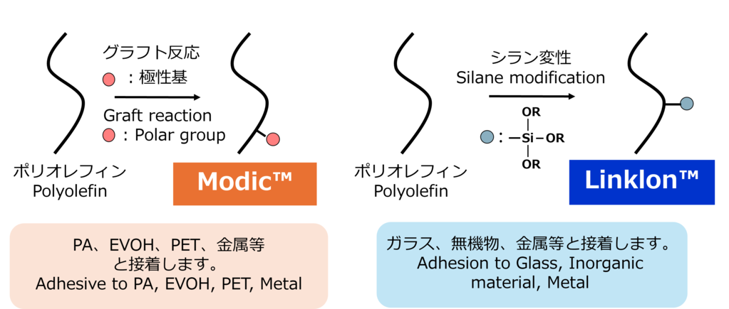 三菱ケミカルの接着性樹脂は、主にポリオレフィンなどの非極性樹脂に酸やシラン変性基などの極性官能基をグラフトし、異種材料との化学的相互作用を発現させます。