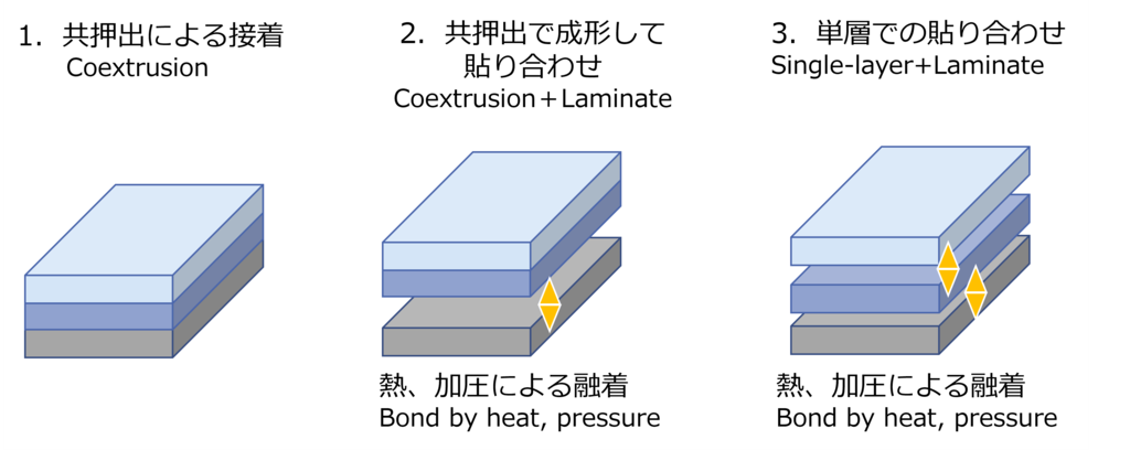 • 多層共押出や押出ラミネート・加熱加圧により接着可能で、接着剤の塗工工程を省略化
