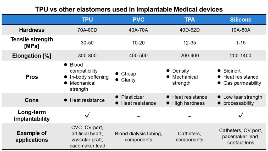 -「柔軟性」と「長期インプラント適合性」を両立しつつ、押出・射出・コーティングなどの加工性も求める用途で、シリコーンとTPUの中間特性が必要な場合に適した選択肢となる。