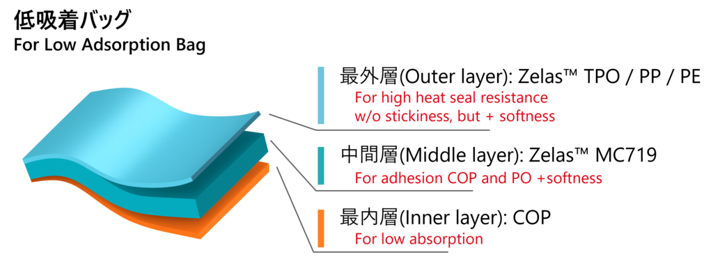 タンパク質・ペプチド・抗体医薬などの吸着が少ないCOPは、低吸着輸液バッグの最内層に使用されます。COP最内層バッグを試したいが、構造設計と外層との接着がハードルという場合、Zelas™ MC719を中間層に使用することで解決できます。