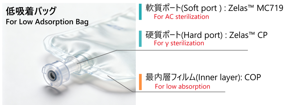 有効成分の吸着を抑えるため、最内層のみCOPとし、外層にはPPやPEなどを組み合わせた「低吸着バッグ」「高機能輸液バッグ」として、抗がん剤・高価薬剤・栄養輸液などでの採用が期待されています。