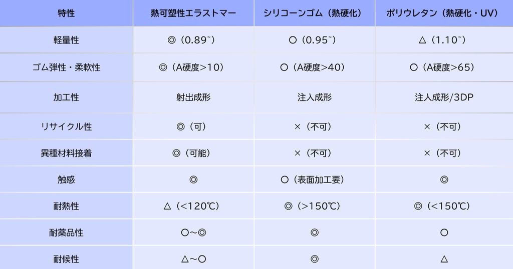 従来のシリコーンゴムやウレタンから熱可塑性エラストマーへのシフトが進む背景と、その実用的なメリットをご紹介します。