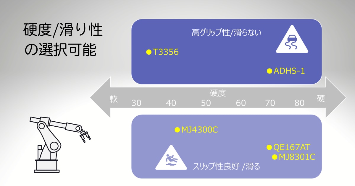 Tefabloc™TPSはSJシリーズ(一般工業用)、MJシリーズ(食品接触対応グレード)、特殊シリーズ(高柔軟用)などを擁し、A硬度10~80程度、静摩擦係数0.5~4.5の範囲で硬度・摩擦特性を自在に調整可能です。用途に応じた最適なハンズの把持性能を有すべく、材料のカスタマイズが可能です。