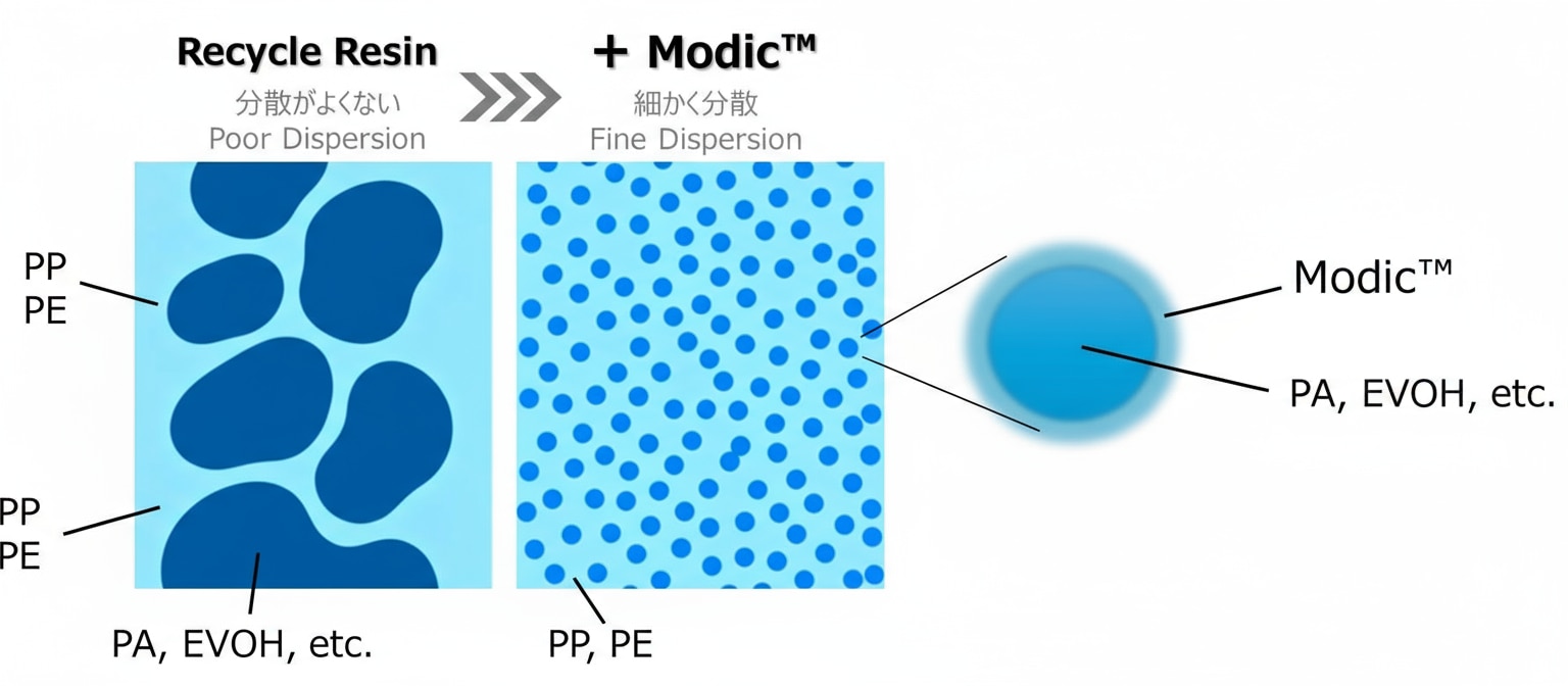 Modic™は、非極性ポリオレフィン(PE、PP等)やポリエステル共重合体にグラフト反応により極性基を導入した機能性樹脂です。この独特な分子構造により、「非極性/極性樹脂」や「樹脂/金属」という通常では化学的組成が異なるため接着しない材料を、Modic™を間に入れることで、接着させることが可能です。 このModic™のポリマー構造の中に相反する化学的性質がある特性を活かし、Modic™は樹脂の混合リサイクルの分散剤として適用されています。