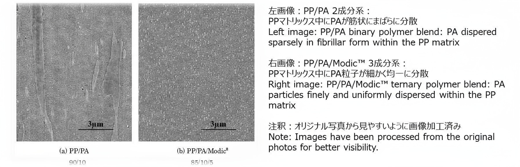 ・右:3成分系(PP/PA/Modic™):PPマトリックス中にPA粒子が細かく均一に分散