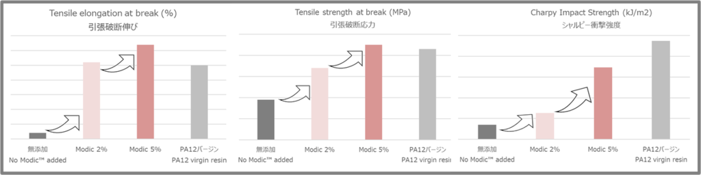 樹脂混合リサイクル材の物性改善にModic™が効果的であることが、わかっていただけたかと思います。