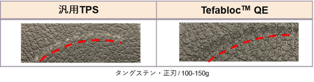 写真を見てわかるように、汎用TPSでは表面の損傷が目立ちやすく白っぽい傷が入っているのに対し、Tefabloc™ QEシリーズは傷が深くならず、見た目の劣化が最小限に抑えられています。これは、表面硬度と内部の弾性のバランスを精密に設計した結果なのです。