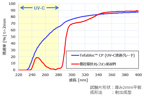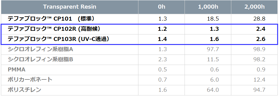 耐UV-Cグレードでは、一般的な透明樹脂では透過しないUV-C光に対して透過能を有し、樹脂に極めてダメージを与えやすいUV-C光に対しても一定の耐久性を有します。