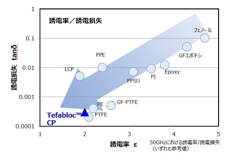 高い周波数耐においても誘電損失・誘電率それぞれにおいて優れた